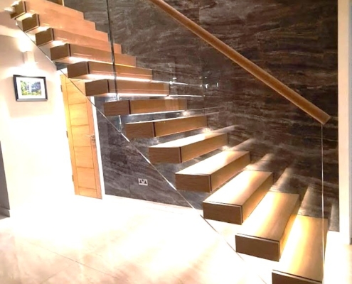 The client was also keen on having specialist dotless LEDs for a super clean lighting effect, all smart home connected. We hid all the wiring behind the plasterboard and tiles, so everything stayed nice and tidy. We matched a 55mm oak handrail to the golden oak treads, and we made sure all the fixings were completely hidden, giving it that seamless, floating look. We also installed a matching landing balustrade that turned back on itself to keep the design consistent throughout.
